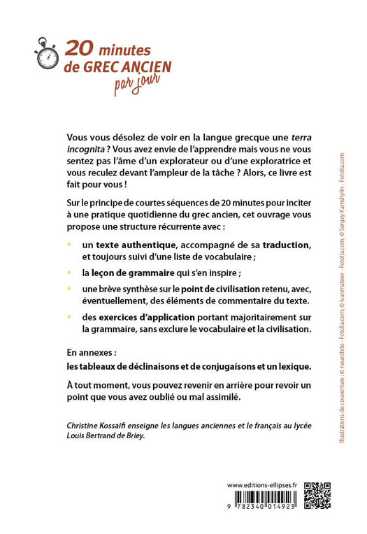 Sur le principe de courtes séquences de 20 minutes pour inciter à une pratique quotidienne du grec ancien, cet ouvrage vous propose une structure récurrente avec :