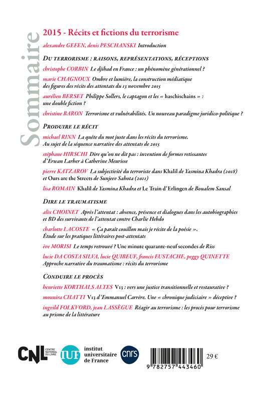 Ce numéro présente une analyse approfondie des récits et fictions engendrés par les attentats de 2015 en France. Il examine comment la culture française a utilisé divers supports narratifs—témoignages, romans, documentaires, bandes dessinées—pour représenter et comprendre ces événements traumatiques.