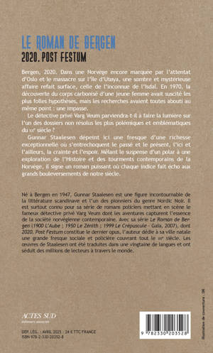 Bergen, 2020. Dans une Norvège encore marquée par l'attentat d'Oslo et le massacre sur l'île d'Utøya, une sombre et mystérieuse affaire refait surface, celle de l'inconnue de l'Isdal. En 1970, la découverte du corps carbonisé d'une jeune femme avait suscité les plus folles hypothèses, mais les recherches avaient toutes abouti au même point : une impasse. Le détective privé Varg Veum parviendra-t-il à faire la lumière sur l'un des dossiers non résolus les plus polémiques et emblématiques du XXe siècle ? Gunnar Staalesen dépeint ici une fresque d'une richesse exceptionnelle où s'entrechoquent le passé et le présent, l'ici et l'ailleurs, la crainte et l'espoir. Mêlant le suspense d'un polar à une exploration de l'Histoire et des tourments contemporains de la Norvège, il signe un roman puissant où chaque indice fait écho aux grands bouleversements de notre siècle.