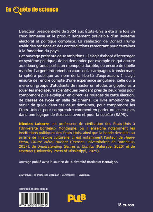 L'élection présidentielle de 2024 aux États-Unis a été à la fois un choc immense et le produit largement prévisible d’un système électoral et politique complexe. La réélection de Donald Trump trahit des tensions et des contradictions remontant pour certaines à la fondation du pays. Cet ouvrage présente deux ambitions. Il s’agit d’abord d’interroger ce système politique, de se demander par exemple ce qui assure aux deux grands partis un monopole durable, ou encore de quelle manière l’argent intervient au cours de la campagne, transformant la sphère publique au nom de la liberté d’expression. Il s’agit ensuite de rendre compte d’une expérience singulière, celle qui a mené un groupe d’étudiants de master en études anglophones à jouer les médiateurs scientifiques pendant près de deux mois pour comprendre puis expliquer en direct les rouages de cette élection, de classes de lycée en salle de cinéma. Ce livre ambitionne de servir de guide dans ces deux domaines, pour comprendre les États-Unis et pour comprendre comment en parler ou les étudier, dans une logique de Sciences avec et pour la société (SAPS).