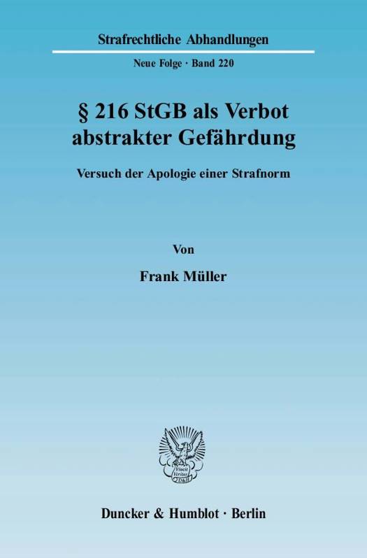 Der Autor widmet sich - ausgehend von einer umfassenden Kritik der überkommenen Legitimationskonzepte - dem Unterfangen einer grundlegenden Neuinterpretation des umstrittenen strafrechtlichen Verbots der Tötung auf Verlangen. Strafgrund des 216 StGB ist danach die der verlangten Tötung immanente (abstrakte) Gefahr eines Vollzugs nicht verantwortlich gefaßter bzw. zum Tatzeitpunkt nicht aktueller Sterbeentschlüsse.
