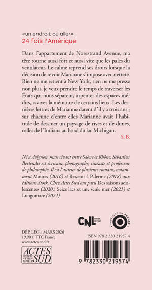 Dans l'appartement de Norestrand Avenue, ma tête tourne aussi fort et aussi vite que les pales du ventilateur. Le calme reprend ses droits lorsque la décision de revoir Marianne s'impose avec netteté. Rien ne me retient à New York, rien ne me presse non plus, je veux prendre le temps de traverser les États qui nous séparent, arpenter des espaces inédits, raviver la mémoire de certains lieux. Les dernières lettres de Marianne datent d'il y a trois ans ; sur chacune d'entre elles Marianne avait l'habitude de dessiner un paysage de rives et de dunes, celles de l'Indiana au bord du lac Michigan.