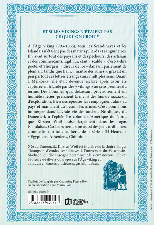 À l'Âge viking (793-1066), tout le monde n'était pas... viking. En effet, ce nom ne renvoie pas à une appartenance ethnique mais à une activité : mener des raids et des expéditions maritimes. Or la grande majorité des Nordiques de ce temps-là n'avaient rien du marin pillard : ils étaient paysans ou pêcheurs, diseurs de loi ou scaldes (poètes de cour), constructeurs de bateaux ou graveurs de runes. On pouvait même être à la fois fermier, commerçant et navigateur ‒ l'épouse dirigeant l'exploitation quand le mari était en mer. Du Danemark à l'éphémère colonie d'Amérique du Nord, Kirsten Wolf nous immerge ainsi dans le monde des « vikings » au sens large du terme en puisant surtout dans les sagas islandaises. Une plongée pleine de surprises dans la vraie vie des anciens Scandinaves et Islandais.