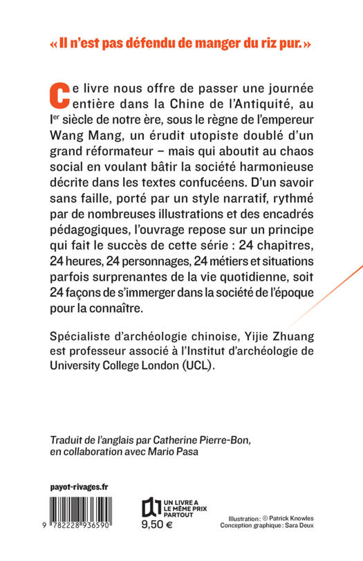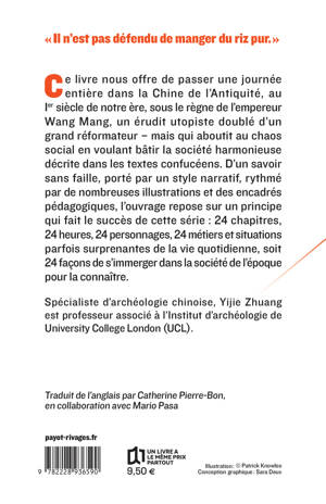 Ce livre nous offre de passer une journée entière dans la Chine de l'Antiquité, au Ier siècle de notre ère, sous le règne de l'empereur Wang Mang, un érudit utopiste doublé d'un grand réformateur - mais qui aboutit au chaos social en voulant bâtir la société harmonieuse décrite dans les textes confucéens. D'un savoir sans faille, porté par un style narratif, rythmé par de nombreuses illustrations et des encadrés pédagogiques, l'ouvrage repose sur un principe qui fait le succès de cette série : 24 chapitres, 24 heures, 24 personnages, 24 métiers et situations parfois surprenantes de la vie quotidienne, soit 24 façons de s'immerger dans la société de l'époque pour la connaître.
