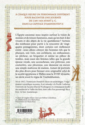 Un portrait très vivant de l'Egypte d'Amenhotep II (vers 1442 av. J.-C.) sur 24 heures, avec un personnage par heure, du pharaon au simple potier, de l'embaumeur au voleur de tombes, en passant par la sage-femme et la pleureuse - ou comment un archéologue de renom nous aide à comprendre une civilisation complexe au moyen d'un docufiction sur papier, dans l'esprit des livres d'Alberto Angela sur l'Antiquité romaine.