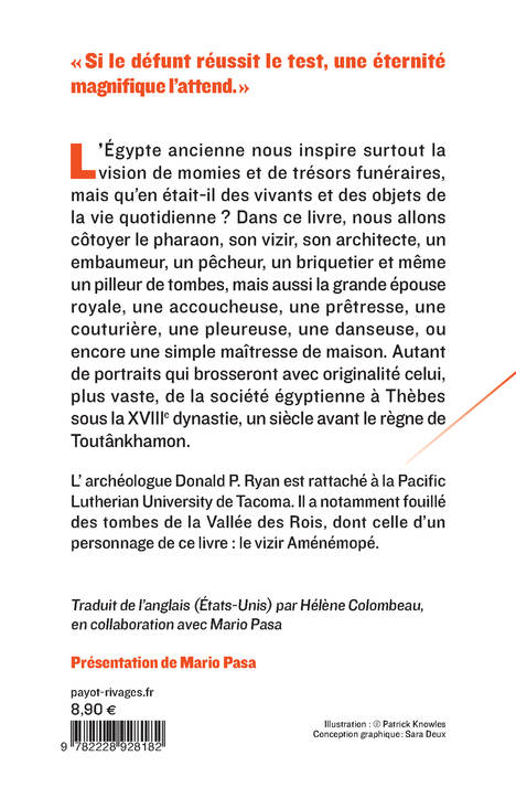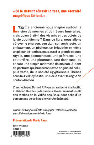 L'Égypte ancienne nous inspire surtout la vision de momies et de trésors funéraires, mais qu'en était-il des vivants et des objets de la vie quotidienne ? Dans ce livre, nous allons côtoyer le pharaon, son vizir, son architecte, un embaumeur, un pêcheur, un briquetier et même un pilleur de tombes, mais aussi la grande épouse royale, une accoucheuse, une prêtresse, une couturière, une pleureuse, une danseuse, ou encore une simple maîtresse de maison. Autant de portraits qui brosseront avec originalité celui, plus vaste, de la société égyptienne à Thèbes sous la xviiie dynastie, un siècle avant le règne de Toutânkhamon.