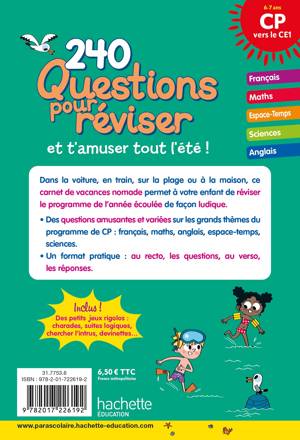 • Dans la voiture, en train, sur la plage ou à la maison, ce carnet de vacances nomade permet à votre enfant de réviser le programme de l'année écoulée de façon ludique. • Des questions amusantes et variées sur les grands thèmes du programme de CP : français, maths, anglais, espace-temps, sciences. • Un format pratique : au recto, les questions, au verso, les réponses.