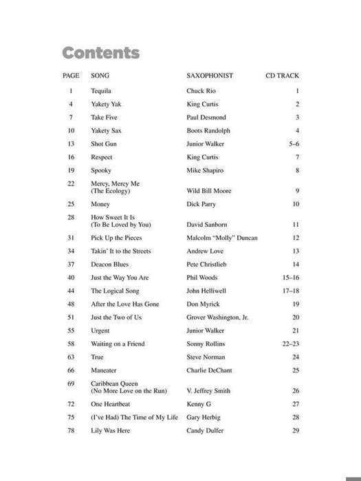 (Sax Instruction). From Chuck Rio and King Curtis to David Sanborn and Kenny G, take an inside look at the genesis of pop saxophone. This book with online audio provides solo transcriptions in standard notation, lessons on how to play them, bios, equipment, photos, history, and much more. The keys vary, covering both tenor and alto sax. In the upper left corner of each song, the specific instrument is listed. The audio contains full-band demos of every sax solo in the book, and includes the PLAYBACK+ audio player which allows you to adjust the recording to any tempo without changing pitch, loop challenging parts, pan, and more! Songs include: After the Love Has Gone * Deacon Blues * Just the Two of Us * Just the Way You Are * Mercy, Mercy Me * Money * Respect * Spooky * Take Five * Tequila * Yakety Sax * and more.