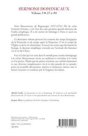 Saint Bonaventure de Bagnoregio (1217-1274), fils de saint François d'Assise, a été l'un des tout premiers grands docteurs de l'ordre séraphique. Il a été maître de théologie à Paris et aussi un grand prédicateur. Ce deuxième volume présente les sermons des temps liturgiques de la Pentecôte et du temps après la Pentecôte. C'est le temps de l'Église et de la vie chrétienne. À travers les textes que lui fournit la liturgie, le docteur séraphique s'attarde sur l'attitude des hommes vis-à-vis du Christ. Face à Celui qui est venu dans le monde pour rendre témoignage à la vérité, Bonaventure invite ses auditeurs à s'attacher à la vérité et à la justice. Plutôt que de prêter attention aux amitiés humaines et aux diverses complaisances vis-à-vis des grands de ce monde, pour en recueillir décorations, mérites et honneurs, mieux vaut se laisser instruire et conduire par le Seigneur lui-même.