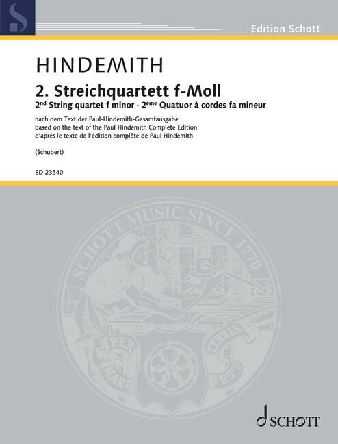 „Depth of content, exuberant liveliness and refinement of compositional technique“ – praises Samuel Rhodes, the violist of the renowned Juilliard String Quartet, Paul Hindemith's string quartets. The composer composed the Quartet op. 10 in 1918 at the front in Alsace, and yet it shows not the slightest influence of the terrible events of the war. The three-movement work is full of youthful exuberance and reflects Hindemith's new compositional techniques. His mastery and imagination in the use of the instruments prove that he was already completely familiar with the string quartet genre. This is the first time that all of Paul Hindemith's string quartets have been published according to the text of the Paul Hindemith Complete Edition. Instrumentation: String quartet op. 10