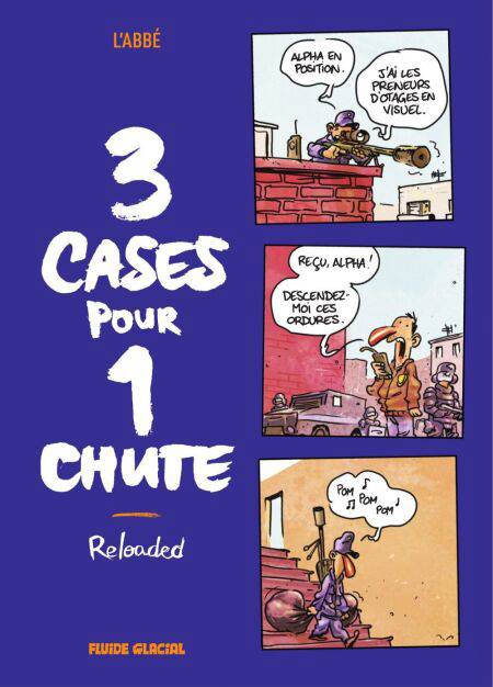 3 cases pour une chute, c’est le concept originel, la contrainte que s’impose L’Abbé pour réussir en un minimum de temps à vous faire rire au maximum. Et c’est d’une efficacité redoutable. Sur le ton de l’humour absurde et trash, L’Abbé déploie devant vos yeux ébahis son art et sa maîtrise du strip.