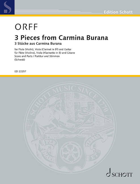 The well-known guitarist Sigi Schwab has created an almost intimate arrangement for guitar, flute (or violin) and viola (or clarinet) from three pieces of the large-scale Carmina Burana. The three pieces can be played directly one after the other like a three-movement work. Instrumentation: flute (violin), viola (clarinet) and guitar