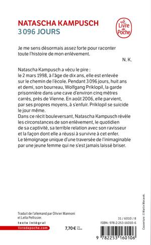 Le 2 mars 1998, la jeune Natascha Kampusch va pour la première fois à l'école à pied. Elle est enlevée sur la route par Wolfgang Priklopil, un ingénieur électricien d'une trentaine d'années. Elle réussira à s'échapper après 3096 jours. Voici le récit de cette captivité terrible: pendant dix ans, elle restera enfermée dans une pièce de 5 mètres carrées, la plupart du temps dans le noir et pendant les six années suivantes elle sera son esclave domestique. Sous le joug de la violence et surtout d'un terrible harcèlement psychique de son agresseur, elle réussira à résister à sa séquestration et à s'enfuir.
