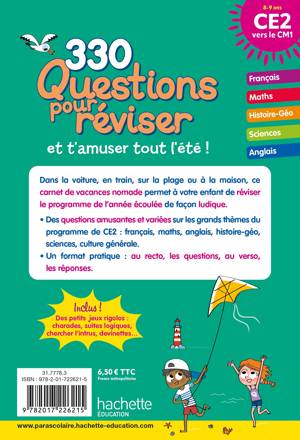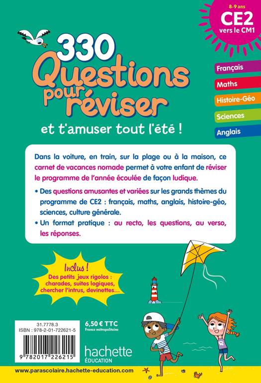 • Dans la voiture, en train, sur la plage ou à la maison, ce carnet de vacances nomade permet à votre enfant de réviser le programme de l'année écoulée de façon ludique. • Des questions amusantes et variées sur les grands thèmes du programme de CE2 : français, maths, anglais, espace-temps, sciences. • Un format pratique : au recto, les questions, au verso, les réponses.