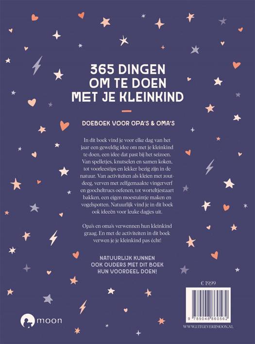 Voor elke dag van het jaar een geweldig idee om met je kleinkind te doen, een idee dat past bij het seizoen. Van buitenactiviteiten, spelletjes, knutselen en samen koken, tot voorleestips en lekker bezig zijn in de natuur. Van activiteiten als kleien met zoutdeeg, kliederen met zelfgemaakte vingerverf en goocheltrucs oefenen, tot worteltjestaart bakken, een eigen moestuintje maken en vogelspotten. Natuurlijk vind je in dit boek ook ideeën voor leuke dagjes uit.