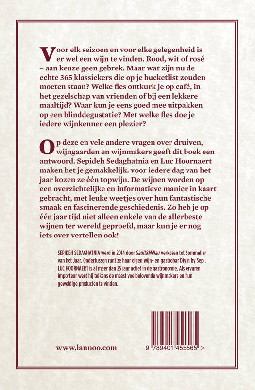 Op deze en vele andere vragen geeft dit boek een antwoord. Sepideh Sedaghatnia en Luc Hoornaert maken het je gemakkelijk: voor iedere dag van het jaar kozen ze één topwijn. De wijnen worden op een overzichtelijke manier in kaart gebracht, met leuke weetjes over hun fantastische smaak en fascinerende geschiedenis. Zo heb je op één jaar tijd niet alleen enkele van de allerbeste wijnen ter wereld geproefd, maar kun je er nog iets over vertellen ook!