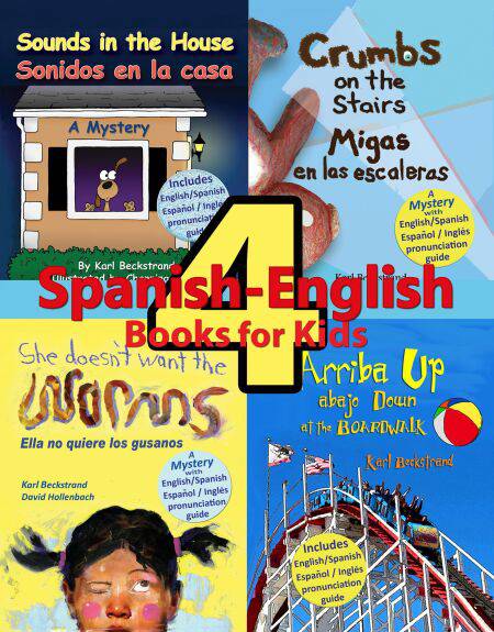 LOOK inside! 8"x10" English-Spanish book with 100 full-color pages—comes with online lesson plan: KidsWorldBooks (Mini-Mysteries for Minors series, worldwide rights ©Jan. 2016) and major bilingual book distributors.