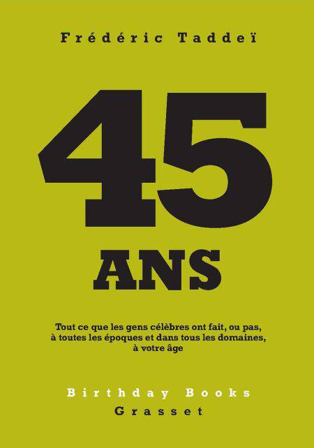 Tout ce que les gens célèbres ont fait, ou pas, à toutes les époques et dans tous les domaines, à votre âge. « L’âge est un quartier de la vie que l’on habite tous ensemble, même si ce n’est pas au même moment. Plusieurs siècles séparent Galilée, Jane Fonda, Philip K. Dick, Cameron Diaz et Napoléon Ier, mais ici, ils ont 45 ans tous les cinq : le premier pointe sa lunette vers le ciel pour la première fois, sa voisine est la reine de l’aérobic, le troisième connaît son « invasion divine », la suivante arrête sa carrière, le dernier est battu à Waterloo. Le succès n’a pas d’âge, les catastrophes non plus. À 45 ans, on peut devenir Gandhi ou Kandinsky, Gisèle Halimi ou sainte Thérèse d’Avila. Mais la case prison est également bien remplie : on y trouve Giordano Bruno, Rosa Luxemburg, Recep Tayip Erdogan, Alexeï Navalny, Nelson Mandela, Auguste Blanqui, Isabel Perón, Samy Naceri. Il y a même le marquis de Sade qui écrit Les cent vingt journées de Sodome à la Bastille… Comme chaque quartier, celui-ci se trouve à la croisée des chemins. » Frédéric Taddeï
