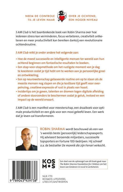 5 AM club is het baanbrekende boek van bestsellerauteur Robin Sharma over hoe iedereen meer productiviteit kan bereiken dankzij een revolutionaire ochtendroutine. En hoe dit stress kan verminderen en een positief effect heeft op je focus, creativiteit en productiviteit.