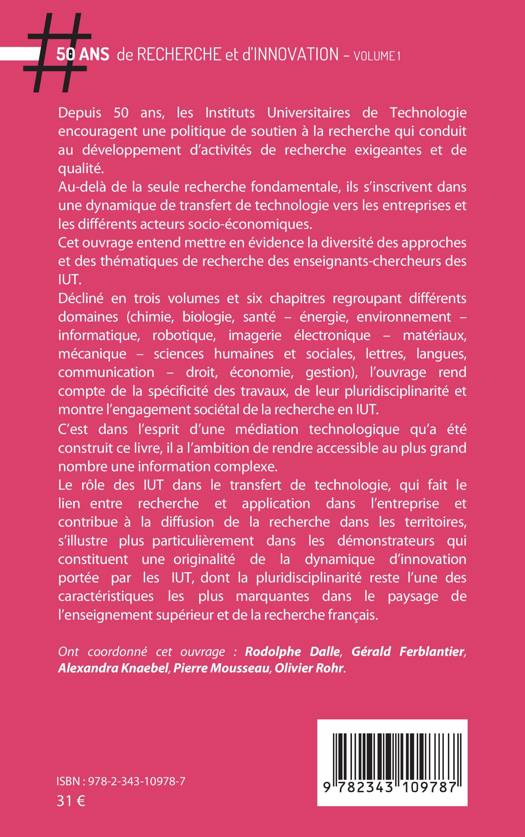 Cet ouvrage entend mettre en évidence la diversité des approches et des thématiques de recherche des enseignants-chercheurs des IUT. Décliné en trois volumes et six chapitres regroupant différents domaines (chimie, biologie, santé - énergie, environnement - informatique, robotique, imagerie électronique - matériaux, mécanique - sciences humaines et sociales, lettre, langues, communication - droit, économie, gestion), l’ouvrage rend compte de la spécificité des travaux, de leur pluridisciplinarité et montre l’engagement sociétal de la recherche en IUT.