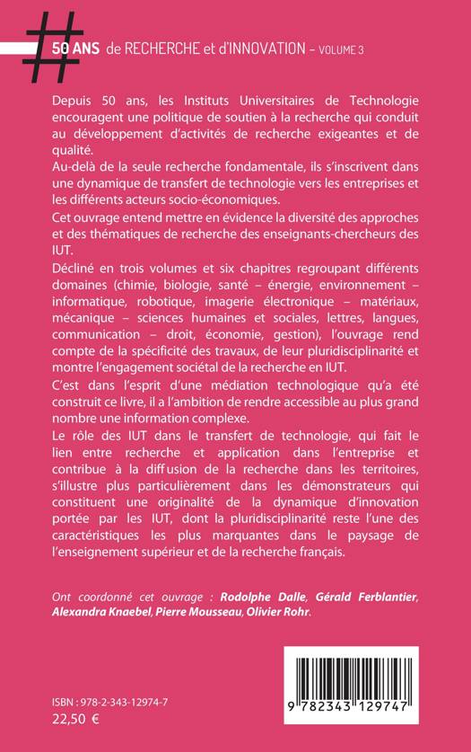 Cet ouvrage entend mettre en évidence la diversité des approches et des thématiques de recherche des enseignants-chercheurs des IUT. Décliné en trois volumes et six chapitres regroupant différents domaines (chimie, biologie, santé - énergie, environnement - informatique, robotique, imagerie électronique - matériaux, mécanique - sciences humaines et sociales, lettre, langues, communication - droit, économie, gestion), l’ouvrage rend compte de la spécificité des travaux, de leur pluridisciplinarité et montre l’engagement sociétal de la recherche en IUT.