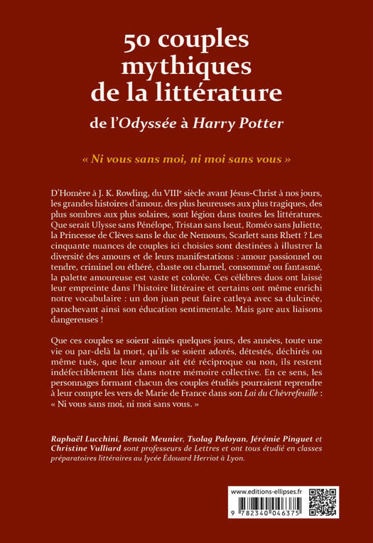 D’Homère à J. K. Rowling, du VIIIe avant Jésus-Christ à nos jours, les grandes histoires d’amour, des plus heureuses aux plus tragiques, des plus sombres aux plus solaires, sont légion dans toutes les littératures. Que serait Ulysse sans Pénélope, Tristan sans Iseut, Roméo sans Juliette, la Princesse de Clèves sans le duc de Nemours, Scarlett sans Rhett ? Les cinquante nuances de couples ici choisies sont destinées à illustrer la diversité des amours et de leurs manifestations : amour passionnel ou tendre, criminel ou éthéré, chaste ou charnel, consommé ou fantasmé, la palette amoureuse est vaste et colorée. Ces célèbres duos ont laissé leur empreinte dans l’histoire littéraire et certains ont même enrichi notre vocabulaire : un don juan peut faire catleya avec sa dulcinée, parachevant ainsi son éducation sentimentale. Mais gare aux liaisons dangereuses !