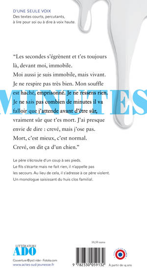 Les minutes s'égrènent, le père est étendu sur le sol. Est-il mort ou simplement évanoui ? Le fils est là, immobile aussi, il n'appellera pas les secours. Au lieu de cela, il s'adresse à ce père violent. Il lui dit l'humiliation des mots qui salissent et détruisent, et pourquoi l'amour de Camille est plus fort que tout. Il va partir, faire sa vie, et le laisser là... Un monologue saisissant du huis clos familial...