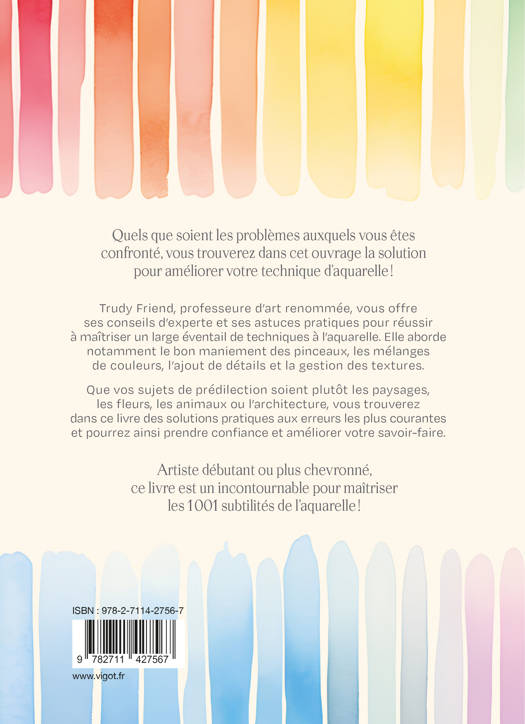 Quels que soient les problèmes auxquels vous êtes confronté, vous trouverez dans cet ouvrage la solution pour améliorer votre technique d’aquarelle ! Trudy Friend, professeure d’art renommée, vous offre ses conseils d’experte et ses astuces pratiques pour réussir à maîtriser un large éventail de techniques à l’aquarelle. Elle aborde notamment le bon maniement des pinceaux, les mélanges de couleurs, l’ajout de détails et la gestion des textures. Que vos sujets de prédilection soient plutôt les paysages, les fleurs, les animaux ou l’architecture, vous trouverez dans ce livre des solutions pratiques aux erreurs les plus courantes et pourrez ainsi prendre confiance et améliorer votre savoir-faire. Artiste débutant ou plus chevronné, ce livre est un incontournable pour maîtriser les 1 001 subtilités de l’aquarelle !