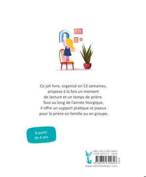 Principe : Chaque semaine/chapitre est construite de la même façon autour d’un thème : - une histoire courte , - une prière , - une citation. Objectif : permettre aux familles d’avoir un petit « support » contextuel, un moment de prière guidée pour intégrer la prière au quotidien. En faire un moment familial spécial, le soir, de lecture-prière avec les petits et les plus grands. Parmi les 52 thèmes abordés : Accompagner la maladie, Avec bienveillance, Cuisiner avec Maman, Un cœur loyal, Un cartable pour l’école, Leçon de courtoisie, Ceux qui sont au Ciel, Les grands-parents, Apprendre à remercier, etc.