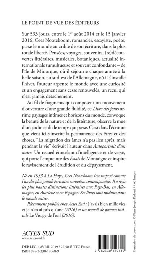 Sur 533 jours, entre le 1er août 2014 et le 15 janvier 2016, Cees Nooteboom, romancier, essayiste, poète, passe le monde au crible de son écriture, dans la plus totale liberté. Pensées, voyages, souvenirs, (re)découvertes littéraires, musicales, botaniques, actualité internationale tumultueuse et souvent confondante - de l'île de Minorque, où il séjourne chaque année à la belle saison, au sud-est de l'Allemagne, où il s'installe l'hiver, l'auteur arpente le monde avec une curiosité et un engagement sans cesse renouvelés, un recul qui n'est jamais détachement.