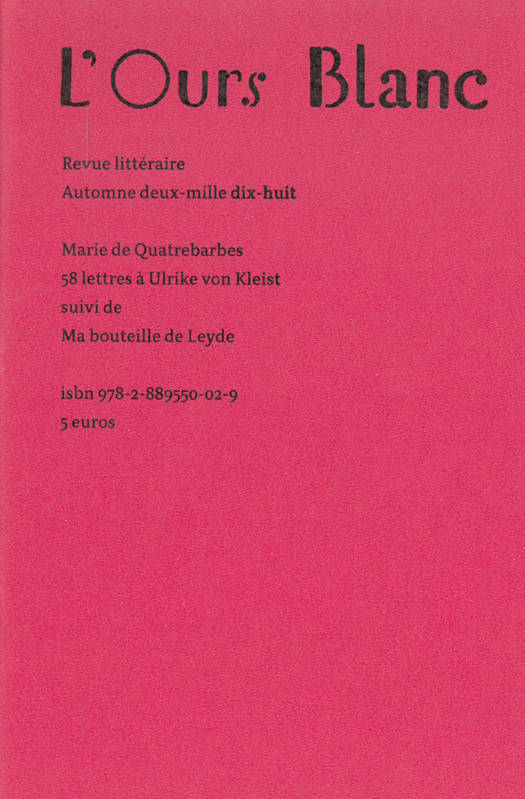 Les 58 lettres que Heinrich von Kleist (1977-1811) écrivit à sa demi-soeur cadette Ulrike sont convoquées dans ce texte fragmenté en 58 courts paragraphes qui y puisent leur matière. Le texte de Marie de Quatrebarbes suit le dispositif du dialogue intime dans lequel la relance est assurée par le silence attentif de cette autre à qui il est adressé. Mais, de la même façon qu’Ulrike s’absente derrière son prénom, la parole qui lui est adressée n’est plus celle de Heinrich et pas non plus tout à fait celle de Marie. On est donc moins le lecteur d’une reprise que d’une déprise. Ce qui circule désormais, c’est une parole qui ignore les déterminations historiques et génériques — une parole qui reconfigure au gré de son flux des intensités. Une parole réellement partagée qui passe de Heinrich à Ulrike et à Marie, et aussi bien au lecteur, à la lectrice qui s’y expose.