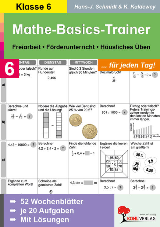 Unser Arbeitsheft für Mathematik in der Sekundarstufe Klasse 6 bietet vielfältige Übungsaufgaben zur Wiederholung, Stärkung und Festigung grundlegender mathematischer Kompetenzen. Der Band umfasst 52 Wochenblätter mit jeweils 20 Aufgaben (4 pro Wochentag), ideal für selbstständiges Arbeiten in der Freiarbeit, für Hausaufgaben, gezielten Förderunterricht oder als zusätzliches Übungsmaterial. Jedes Blatt enthält Lösungen zur Selbstkontrolle.Diese Kopiervorlagen eignen sich für kontinuierliches Training und können gezielt zur Förderung von Schülern mit Lernbedarf genutzt werden. Die Aufgaben dienen auch zum häuslichen Üben. Um die Lösungen nicht sofort preiszugeben, kann das wöchentliche Blatt entsprechend umgeknickt werden. Durch zweimaliges Knicken erhält man den unteren Teil der Vorlage, um die Ergebnisse festzuhalten.Unser Heft "Der Mathe-Basis-Trainer für jeden Tag" bietet eine gezielte Unterstützung für ein permanentes Training in verschiedenen mathematischen Themenbereichen. Es ermöglicht auch eine individuelle Förderung der Schülerinnen und Schüler durch häusliche Übungen und die Zusammenarbeit mit den Eltern zur Lösungskontrolle.Auf Seite 55 finden Sie zudem ein Leerschema, um individuelle Aufgaben für jeden Schüler zu erstellen, was die differenzierte Förderung im Unterricht unterstützt.Mit dieser Methode stellen wir sicher, dass kein mathematisches Thema in Vergessenheit gerät.56 Seiten, mit Lösungen