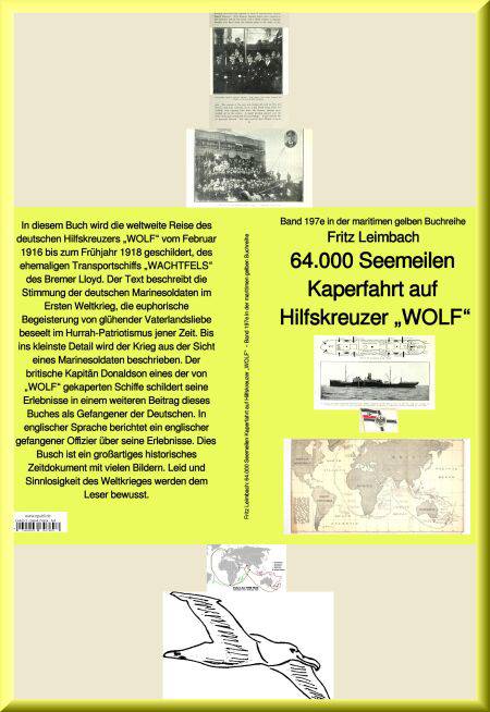In diesem Buch wird die weltweite Reise des deutschen Hilfskreuzers "WOLF" vom Februar 1916 bis zum Frühjahr 1918 geschildert, des ehemaligen Transportschiffs "WACHTFELS" des Bremer Lloyd. Der Text beschreibt die Stimmung der deutschen Marinesoldaten im Ersten Weltkrieg, die euphorische Begeisterung von glühender Vaterlandsliebe beseelt im Hurrah-Patriotismus jener Zeit. Bis ins kleinste Detail wird der Krieg aus der Sicht eines Marinesoldaten beschrieben. Der britische Kapitän Donaldson eines der von "WOLF" gekaperten Schiffe schildert seine Erlebnisse in einem weiteren Beitrag dieses Buches als Gefangener der Deutschen. In englischer Sprache berichtet ein englischer gefangener Offizier über seine Erlebnisse. Dies Busch ist ein großartiges historisches Zeitdokument mit vielen Bildern. Leid und Sinnlosigkeit des Weltkrieges werden dem Leser bewusst. - Rezension zur maritimen gelben Reihe: Ich bin immer wieder begeistert von der "Gelben Buchreihe". Die Bände reißen einen einfach mit. Inzwischen habe ich ca. 20 Bände erworben und freue mich immer wieder, wenn ein neues Buch erscheint. oder: Sämtliche von Jürgen Ruszkowski aus Hamburg herausgegebene Bücher sind absolute Highlights. Dieser Band macht da keine Ausnahme. Sehr interessante und abwechslungsreiche Themen aus verschiedenen Zeit-Epochen, die mich von der ersten bis zur letzten Seite gefesselt haben! Man kann nur staunen, was der Mann in seinem Ruhestand schon veröffentlicht hat. Alle Achtung!