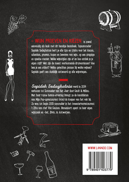 Wijn proeven en kiezen is zowel eenvoudig als leuk met dit handige basisboek Wijn proeven en kiezen is zowel eenvoudig als leuk met dit handige basisboek. Topsommelier Sepideh Sedaghatnia leert je alle tips en tricks voor het kiezen, schenken, proeven, kopen en bewaren van wijn, op een grappige en speelse manier. Welke wijnstijlen zijn er en hoe ontdek je je eigen stijl? Wat zijn de meest voorkomende druivenrassen? Hoe lees je een etiket? Welke gerechten passen bij welke wijnen? Sepideh geeft een duidelijk antwoord op alle wijnvragen.