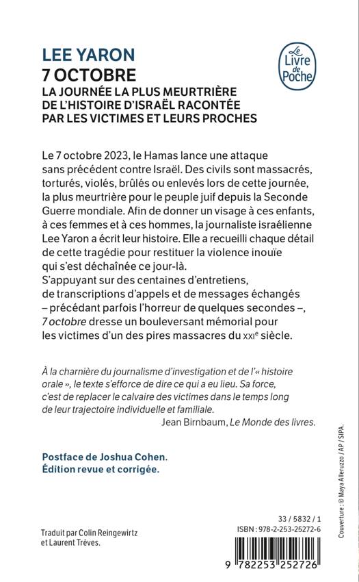 Le 7 octobre 2023, le Hamas lance une attaque sans précédent contre Israël. Des civils sont massacrés, torturés, violés, brûlés ou enlevés lors de cette journée, la plus meurtrière pour le peuple juif depuis la Seconde Guerre mondiale. Afin de donner un visage à ces enfants, à ces femmes et à ces hommes, la journaliste israélienne Lee Yaron a écrit leur histoire. Elle a recueilli chaque détail de cette tragédie pour restituer la violence inouïe qui s’est déchaînée ce jour-là. S’appuyant sur des centaines d’entretiens, de transcriptions d’appels et de messages échangés – précédant parfois l’horreur de quelques secondes –, 7 octobre dresse un bouleversant mémorial pour les victimes d’un des pires massacres du xxie siècle.