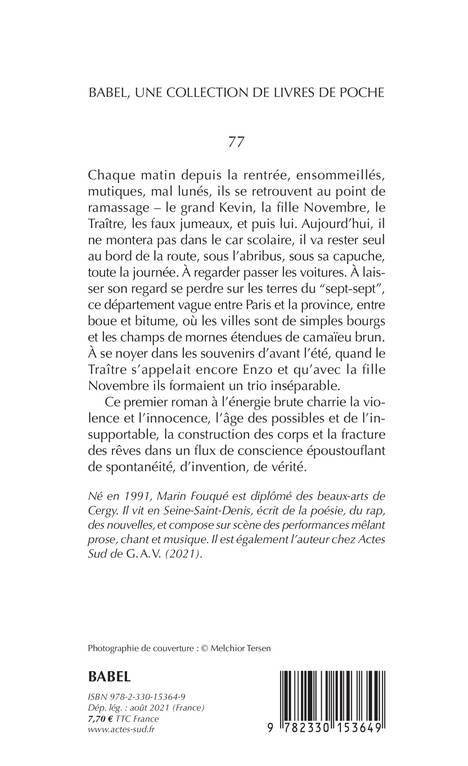 Chaque matin depuis la rentrée, ensommeillés, mutiques, mal lunés, ils se retrouvent au point de ramassage - le grand Kevin, la fille Novembre, le Traître, les faux jumeaux, et puis lui. Aujourd'hui, il ne montera pas dans le car scolaire, il va rester seul au bord de la route, sous l'abribus, sous sa capuche, toute la journée. À regarder passer les voitures. À laisser son regard se perdre sur les terres du "sept-sept", ce département vague entre Paris et la province, entre boue et bitume, où les villes sont de simples bourgs et les champs de mornes étendues de camaïeu brun. À se noyer dans les souvenirs d'avant l'été, quand le Traître s'appelait encore Enzo et qu'avec la fille Novembre ils formaient un trio inséparable. Ce premier roman à l'énergie brute charrie la violence et l'innocence, l'âge des possibles et de l'insupportable, la construction des corps et la fracture des rêves dans un flux de conscience époustouflant de spontanéité, d'invention, de vérité.