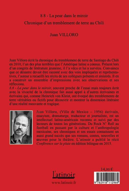 Juan Villoro raconte comment il s'est retrouvé à comparer l'intensité de deux des plus terribles tremblements de terre qu'a connus l'Amérique latine : Mexico 1985 et Santiago du Chili 2010. Convaincu que ces désastres devaient être racontés avec des voix impliquées représentatives, l'auteur a recueilli des témoignages d'où ne sont absents ni le suspens ni l'absurde. Avec la narration chorale sur les distinctes tragédies de survie à l'effroi, 8.8 de magnitude. La Peur dans le miroir fait appel à l'essai et au récit, mais aussi au témoignage d'autres écrivains qui, comme Kleist, racontent des tremblements de terres véritables ou fictifs dans le but de découvrir les dimensions d'une réalité mouvante.