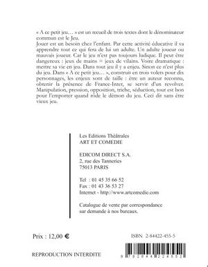 A ce petit jeu... est un recueil de trois textes dont le dénominateur commun est le Jeu. Jouer est un besoin chez l'enfant. Par cette activité éducative il va apprendre tout ce qui fera de lui un adulte. Un adulte joueur ou mauvais joueur. Car le jeu n'est pas toujours ludique. Il peut être dangereux: jeux de mains = jeux de vilains. Voire dramatique: mettre sa vie en jeu. Dans tout jeu il y a enjeu. Sinon ce n'est plus du jeu. Dans A ce petit jeu..., construit en trois volets pour dix personnages, les enjeux sont de taille: être un auteur reconnu, obtenir la présence de France-Inter, se servir d'un revolver. Manipulation, pression, opposition, triche, séduction, tout est bon pour l'emporter quand rôde le démon du jeu. Ceci dit sans être vieux jeu.