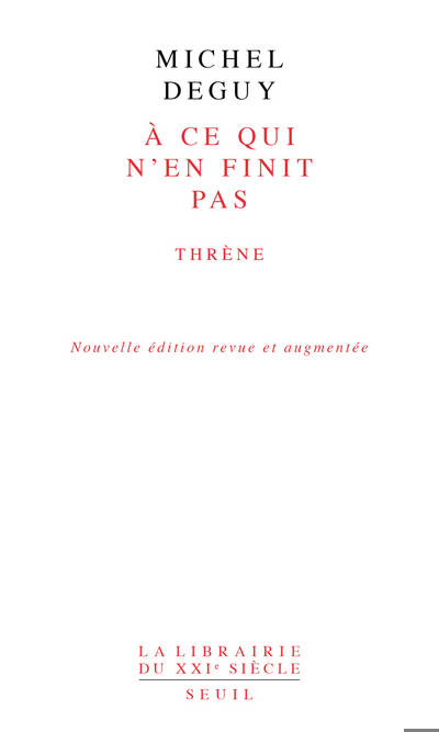 Le thrène et un chant funèbre accompagné de danses. Te survivre ne va pas de soi. Je ne crois à aucune survie hors celle qui est la mienne pour aujourd’hui et qui reprend la peine au réveil. Je ne crois à aucun commerce avec les morts hormis celui que j’entretiens avec ton empreinte en moi. Je ne crois à aucune vie éternelle, nous ne nous retrouverons jamais nulle part, et c’est précisément ce défoncement du futur qu’aucun travail de deuil ne remblaiera en quoi consiste la tristesse, cette tristesse qui disparaîtra à son tour avec « moi ». Il y a un mois mourait ma femme. Je ne peux dire tu mourais, d’un tu affolant, sans destinataire ; et je dis bien « mourait », non pas dépérissait ou lisait ou voyageait ou dormait ou riait, mais « mourait », comme si c’était un verbe, comme s’il y avait un sujet à ce verbe parmi d’autres. Le livre sera non paginé parce que chaque page, ou presque, pourrait être la première, ou la nième. Tout recommence à chaque page ; tout finit à chaque page. M. D.