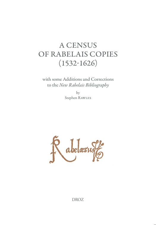 This Census of Rabelais Copies reflects the digital revolution in library cataloguing, incorporating a complete rechecking for early Rabelais copies, notably in the Worldcat database. Every copy recorded has been further verified in the catalogues of the individual libraries concerned. Alongside numerous corrections and additions to the 1987 publication, based on excellent bibliographical and more general scholarship, this Census increases the total number of known copies of Rabelais, dated between 1532 and 1626, and in public hands, from about 750 to nearly 1100, of which well over 100 are available for consultation on-line.