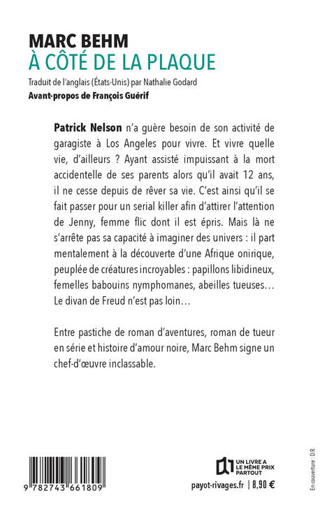 Si vous prenez l'avion, volez donc avec Marc Behm, l'auteur de Mortelle Randonnée. Avec lui, vous oublierez les trous d'air et planerez très haut. Notamment avec son roman particulièrement allumé, A coté de la plaque, l'histoire de Patrick, un petit frère de Walter Mitty, qui, dans la glauque réalité, est garagiste et s'intéresse un peu trop aux exploits d'un serial killer, le boucher, pour attirer sur lui l'attention d'une femme-flic dont il est épris. Ce qui ne l'empêche pas de passer de l'autre côté du miroir en devenant le plus délirant des explorateurs d'une Afrique onirique peuplée de papillons libidineux, d'abeilles tueuses, de fourmis comestibles, de babouins ivres de luxure et autres merveilles du continent noir freudien. Mais la réalité est encore plus cinglée avec ses postières