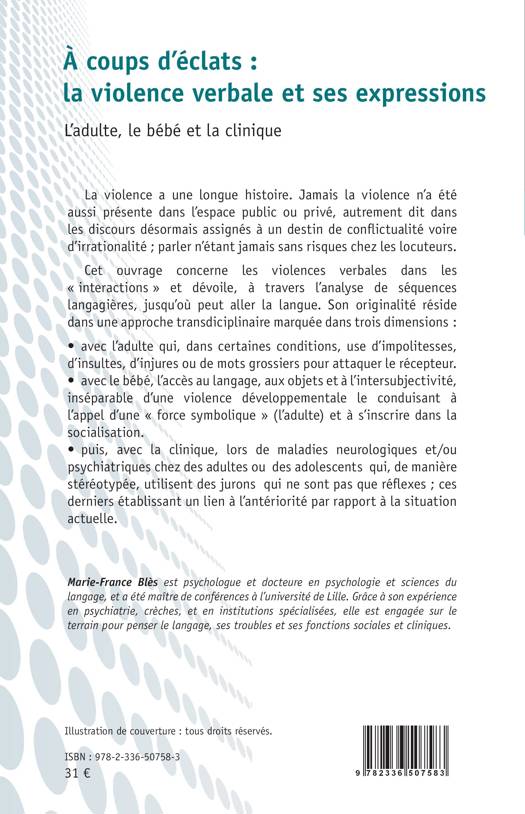 La violence a une longue histoire. Jamais la violence n'a été aussi présente dans l'espace public ou privé, autrement dit dans les discours désormais assignés à un destin de conflictualité voire d'irrationalité; parler n'étant jamais sans risques chez les locuteurs. Cet ouvrage concerne les violences verbales dans les interactions et dévoile, à travers l'analyse de séquences langagières, jusqu'où peut aller la langue. Son originalité réside dans une approche transdiciplinaire marquée dans trois dimensions: - avec l'adulte qui, dans certaines conditions, use d'impolitesses, d'insultes, d'injures ou de mots grossiers pour attaquer le récepteur. - avec le bébé, l'accès au langage, aux objets et à l'intersubjectivité, inséparable d'une violence développementale le conduisant à l'appel d'une force symbolique (l'adulte) et à s'inscrire dans la socialisation. - puis, avec la clinique, lors de maladies neurologiques et/ou psychiatriques chez des adultes ou des adolescents qui, de manière stéréotypée, utilisent des jurons qui ne sont pas que réflexes; ces derniers établissant un lien à l'antériorité par rapport à la situation actuelle.