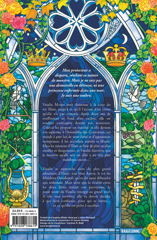 Vasalie Moran était danseuse à la cour du roi Illian, jusqu'à ce qu'il l'accuse d'un crime qu'elle n'a pas commis. Après deux ans de souffrances au fond d'un cachot, elle est soudain convoquée devant son souverain. Celui-ci lui propose un marché : si elle devient son espionne à l'Assemblée des Couronnes, un monde à part fait de verre fumé et d'apparences trompeuses, il lui accordera ensuite sa liberté. Mais les missions d'Illian se font de plus en plus cruelles et dangereuses, et Vasalie découvre que le monstre qu'elle sert est allié à un être plus maléfique encore...