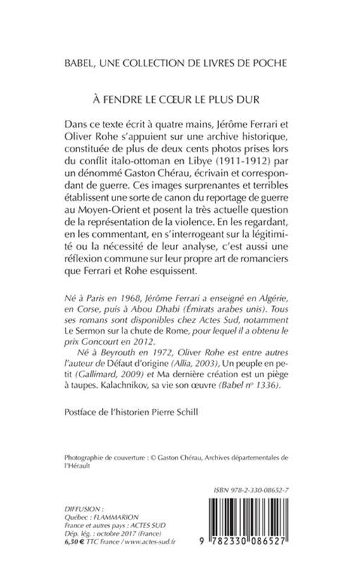 Dans ce texte écrit à quatre mains, Jérôme Ferrari et Oliver Rohe s'appuient sur une archive historique, constituée de plus de deux cents photos prises lors du conflit italo-ottoman en Libye (1911-1912) par un dénommé Gaston Chérau, écrivain et correspondant de guerre. Ces images surprenantes et terribles établissent une sorte de canon du reportage de guerre au Moyen-Orient et posent la très actuelle question de la représentation de la violence. En les regardant, en les commentant, en s'interrogeant sur la légitimité ou la nécessité de leur analyse, c'est aussi une réflexion commune sur leur propre art de romanciers que Ferrari et Rohe esquissent.