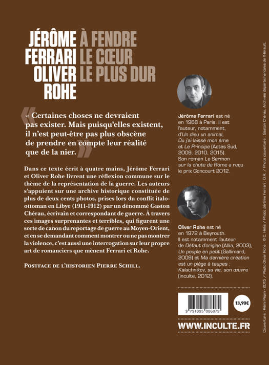 Dans ce texte écrit à quatre mains, Jérôme Ferrari et Oliver Rohe livrent une réflexion commune sur un thème essentiel de leurs oeuvres respectives : la représentation de la guerre. Les auteurs s'appuient sur une archive historique, constituée de plusieurs centaines de photos prises lors du conflit italo-ottoman en Libye (1911-1912) par un dénommé Gaston Chérau, écrivain et correspondant de guerre, et portées à leur connaissance grâce au travail de l'historien Pierre Schill, qui signe la postface du livre. Ces images, qui ne montrent pas des armées qui s'affrontent mais, plutôt, les événements tels que les vit la population, des procès, des exécutions, établissent une sorte de canon du reportage de guerre au Moyen-Orient. En questionnant ces représentations, en se demandant comment montrer ou ne pas montrer la violence, c'est aussi une interrogation sur leur propre art de romanciers que Ferrari et Rohe esquissent.