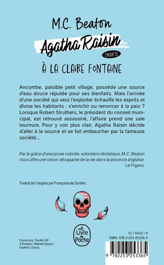 Ancombe, paisible petit village, possède une source d’eau douce réputée pour ses bienfaits. Mais l’arrivée d’une société qui veut l’exploiter échauffe les esprits et divise les habitants : s’enrichir ou renoncer à la paix ? Lorsque Robert Struthers, le président du conseil municipal, est retrouvé assassiné, l’affaire prend une sale tournure. Pour y voir plus clair, Agatha Raisin décide d’aller à la source et se fait embaucher par la fameuse société…