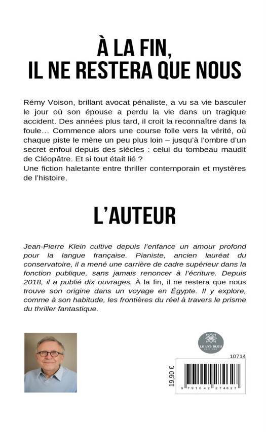 Rémy Voison, brillant avocat pénaliste, a vu sa vie basculer le jour où son épouse a perdu la vie dans un tragique accident. Des années plus tard, il croit la reconnaître dans la foule... Commence alors une course folle vers la vérité, où chaque piste le mène un peu plus loin - jusqu'à l'ombre d'un secret enfoui depuis des siècles : celui du tombeau maudit de Cléopâtre. Et si tout était lié ? Une fiction haletante entre thriller contemporain et mystères de l'histoire.