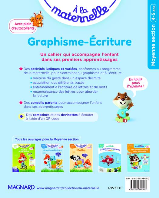Un cahier conçu par des enseignants pour aborder les apprentissages fondamentaux en graphisme et en écriture. Des activités ludiques et variées pour les enfants de 4-5 ans, conformes aux objectifs de la maternelle, pour s’entraîner au graphisme et à l’écriture, et entrer pas à pas dans la lecture :