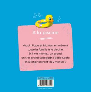 Youpi ! Papa et Maman emmènent toute la famille à la piscine. Et il y a même... un grand, un très grand toboggan ! Bébé Koala et Allistair oseront-ils y monter ? Retrouvez une nouvelle aventure de notre petit personnage préféré dans un nouveau format plus grand et cartonné !