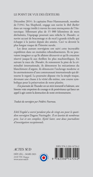 Décembre 2014 : le capitaine Peter Hammarstedt, membre de l'ONG Sea Shepherd, engage son navire le Bob Barker dans un voyage inédit à travers les eaux menaçantes de l'Antarctique. Sillonnant plus de 15 000 kilomètres de mers déchaînées, l'équipage poursuit sans relâche le Thunder, ce navire accusé de braconnage et de recel à grande échelle qui échappe à la justice depuis des années. Ceci va devenir la plus longue traque de l'histoire navale. Les deux auteurs norvégiens ont suivi cette incroyable expédition dans ses moindres rebondissements. Ils ne pouvaient imaginer ce qu'ils allaient découvrir et qu'ils croyaient réservé jusque-là aux thrillers les plus machiavéliques. En suivant la trace du Thunder, ils remontent la piste de la criminalité internationale, ils démontent les mécanismes du blanchiment d'argent, ils dénoncent l'esclavage moderne et les atermoiements d'une communauté internationale qui détourne le regard. La poursuite dépasse vite la simple traque, devenant une chasse à la vérité elle-même, une course symbolique pour la préservation de notre planète. À la poursuite du Thunder est un récit immersif et haletant, une histoire vraie empreinte de courage et de persévérance qui lance un appel à agir contre la destruction de notre environnement.
